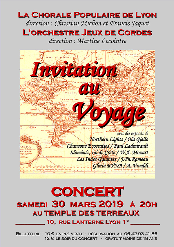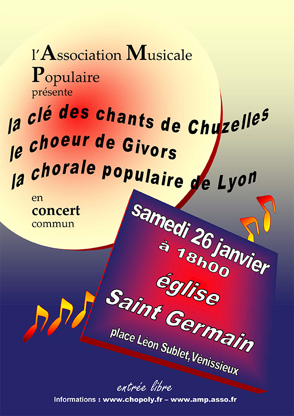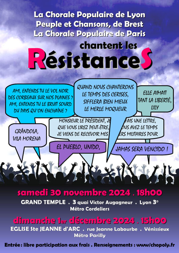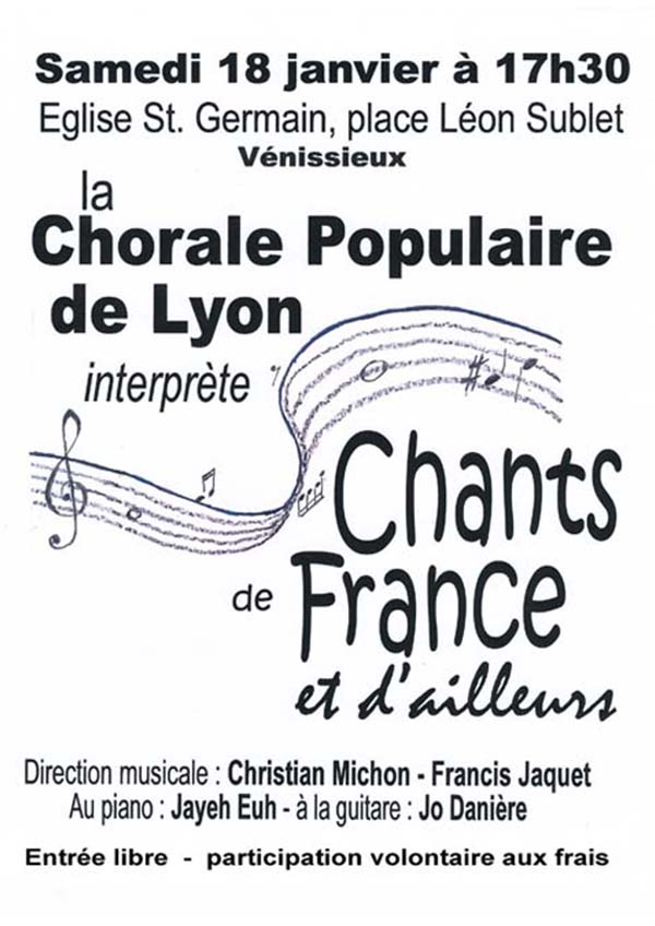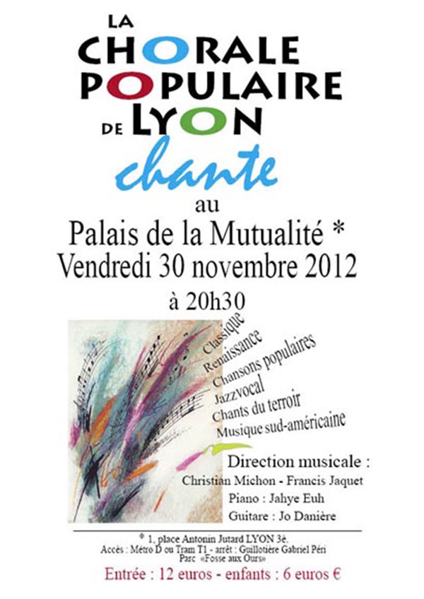 Les différentes activités de la Chorale Populaire de Lyon, en cours ou passées : Répétitions Ateliers vocaux Cabarets Semaines musicales Tournées Échanges Saisons passées Ci-dessous, quelques affiches de concerts des saisons passées…