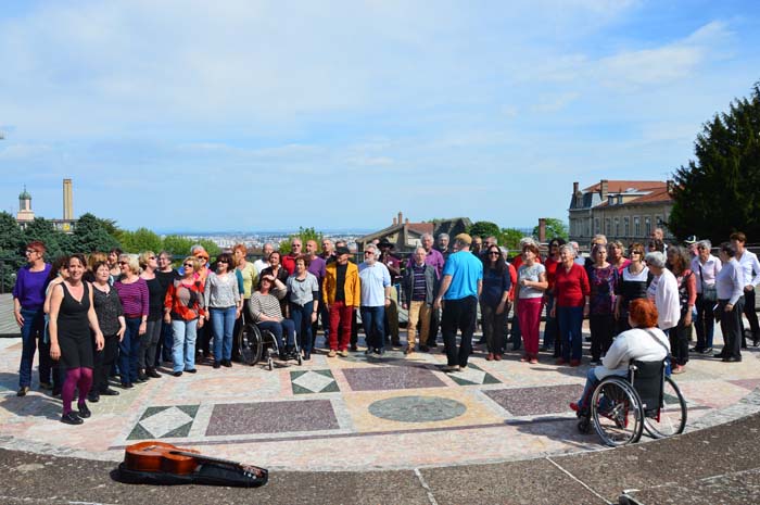 Échanges avec la chorale Atout Chœur de Montpellier dirigée par Corinne Lecomte. Après notre déplacement sur 2 jours en 2014, nous les recevions à Lyon fin avril 2015. Au programme, musique et visites : un concert commun à l’église St-Germain-de-Vénissieux, une battle improvisée à l’Odéon de Fourvière, la visite du Musée urbain Tony Garnier, la descente des pentes de la Croix-Rousse guidé par Robert Luc.