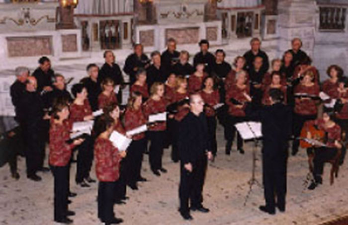 Échanges avec 2 formations de Mantoue, la Cappella Musicale Mario Pettorelli, et la Brigata Corale Tre Laghi. Photo : au Théâtre Bibiena à Mantoue, 2004.