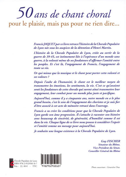 2007 : pour le cinquantenaire de la CPL, Francis Jaquet a écrit l’ouvrage Chanter pour dire le monde, un récit abondamment illustré de l’aventure musicale de la Chorale Populaire de Lyon…
